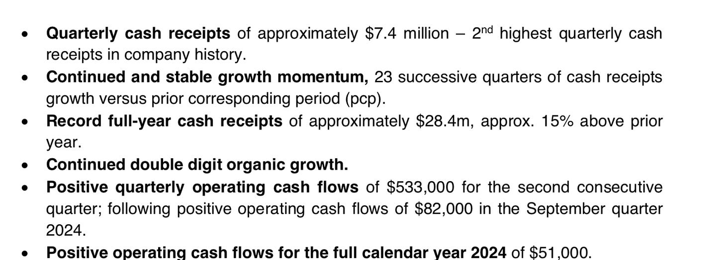 DEM — We released a report on De.mem, the Australian water treatment company, all the way back in May. Link. Key aspects to the thesis were heading towards cashflow positive & prudent management of their strategy … slow and steady wins the race. Stoked to see they’ve reached cashflow positive, while cash receipts continue to grow, reflecting the SaaS-like qualities of their products — see below: