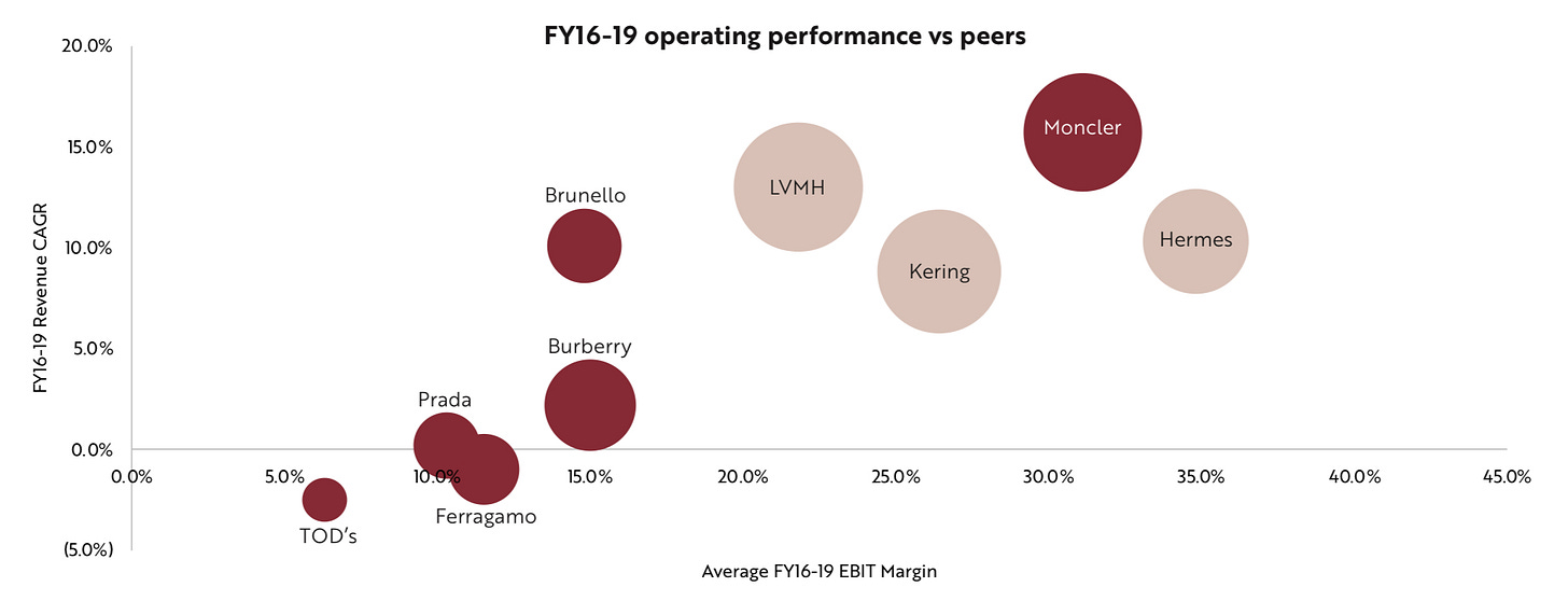 I don’t think Mulberry is that interesting of a stock — it’s an interesting speccy arb perhaps but emphasis on the “speccy” part. I think Burberry is more compelling — because there’s brand value there on a recognisable and global scale. Likewise, I think single high performing brands like Moncler are compelling, though they trade at a relative premium. With interest rates beginning to fall and patriarchs getting older, I expect fashion M&A activity to increase. As such, I present to you —