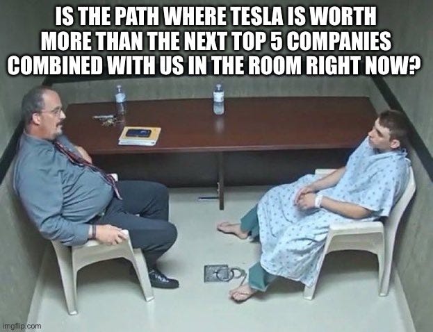 “I see a path of Tesla being the most valuable company in the world by far, not even close, maybe several times more than. Absolutely. There is a path where Tesla is worth more than the next top 5 companies combined. There is a path to that”