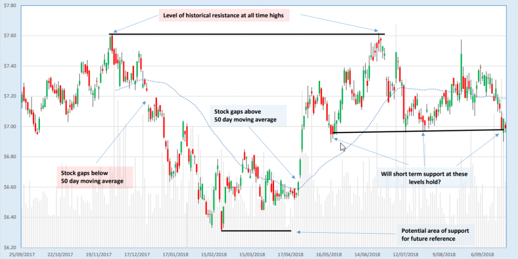 Technical Summary: After a strong run the stock of SYD has been in a consolidation phase for the last couple of years. This action has reflected on the one year chart where the stock is trading in almost the exact same place as it was a year ago. Therefore there are two questions to ask, when will the stock move out of its trading range and in which direction. Both of those questions are unknowables at this stage so it makes sense to focus on support and resistance levels. There appears to be strong resistance at all time highs, around $7.60 per share. While there are a couple of areas of support on the one year chart. Investors or traders may like to buy the stock at these areas of support subject to the levels being held.