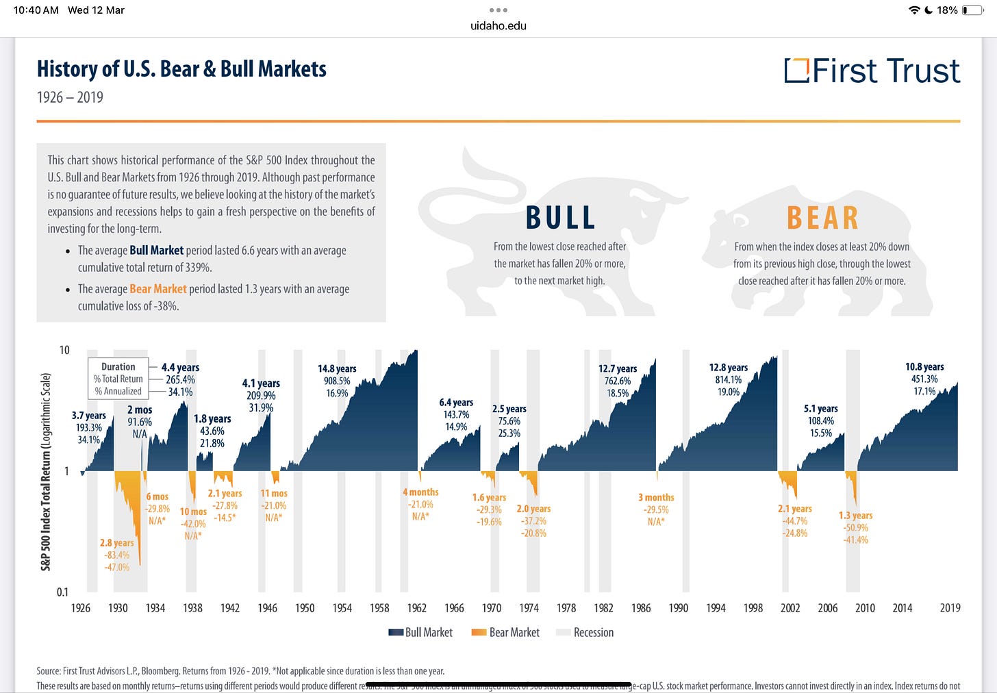 But this does, obviously, rile the market. You have talk of recession and you have talk of stagflation and of course — after the initial “Trump Trade” bump — you have a market in decline. Note we have had a bull market since ‘22, and prior to that, an extraordinary 10.8 year bull market (see chart from the University of Idaho below):