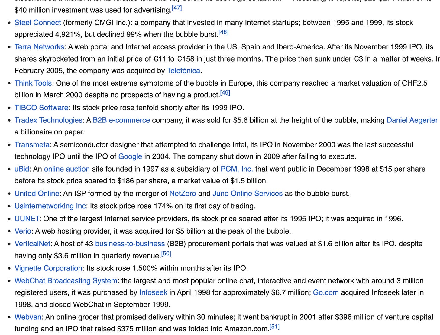 I bet someone will write in and say but Eden! Markets are efficient! So here’s a screenshot from Wikipedia of just some of the companies that went bust during the dot com bubble: